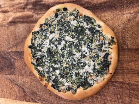 Made locally by Noujaim’s Bistro, a spinach goat cheese pie is a decadent snack or appetizer. To heat, place into a preheated toaster oven (or regular oven) at 400°F. Heat for 10-15 minutes or until top of pie shows a pizza-like consistency.